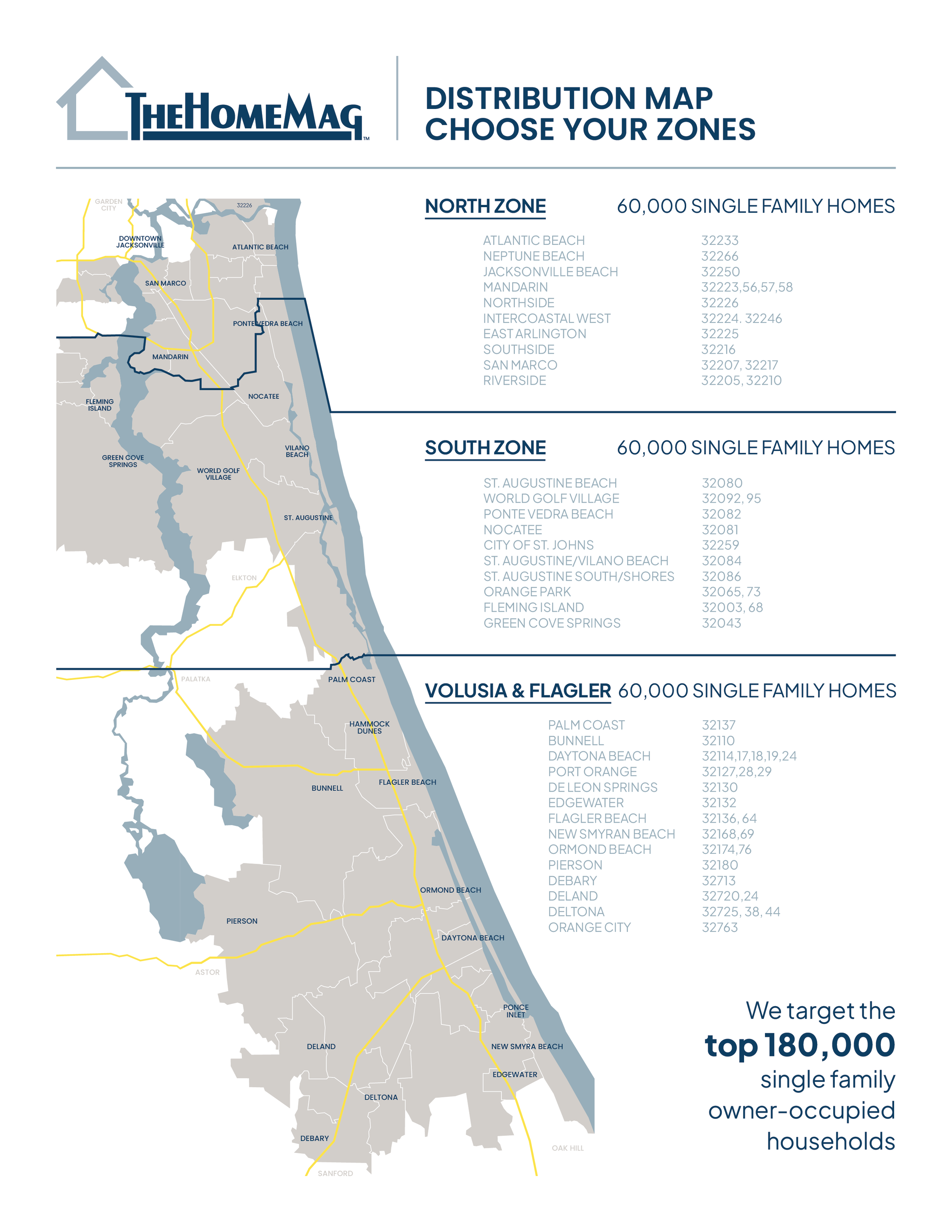 TheHomeMag strives to select only owner-occupied single-family homes of better values, incomes, and buying capacities. In our Jacksonville/Daytona magazine, we mail to a little more than 180,000 homes once monthly, 13 times annually.